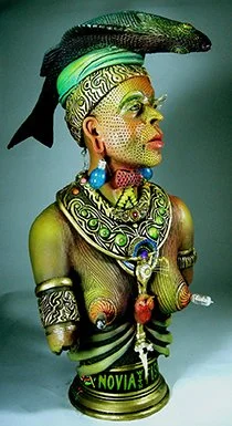 This piece was inspired by meeting Carol Beckwith an American photographer who with her photography partner Angela Fisher from Australia, lived in Africa for about 25 years, documenting African ceremonies and rituals. That work was featured in National Geogrphic and culminated in the most beautiful and interesting large, two volume folio titled “African Ceremeonies.” Linda and I were moved by her slide presentation and our conversations with her. Carol loved Linda’s handcolored silver prints and asked if she could trade her two volume set for one of Linda’s pieces. Yes, gladly - an honor for both artists. I began a sculpture modeled after a young Gullah woman named Novia, and the piece morphed into this sculpture - inspired by Novia, Carol and a photograph that Carol had taken that was part of her folio.